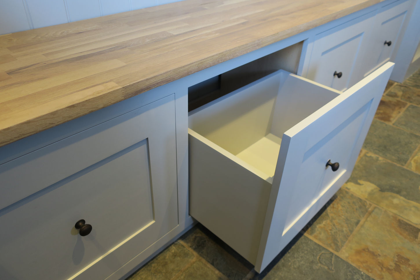 The boot store has solid oak top finished with Osmo TopOil White to match the cupboard worktops and to offer protection from water and mud. The piece is hand painted with Neptune Driftwood eggshell, with Corston Architectural Detail Barlow Furniture Knob bronze handles.